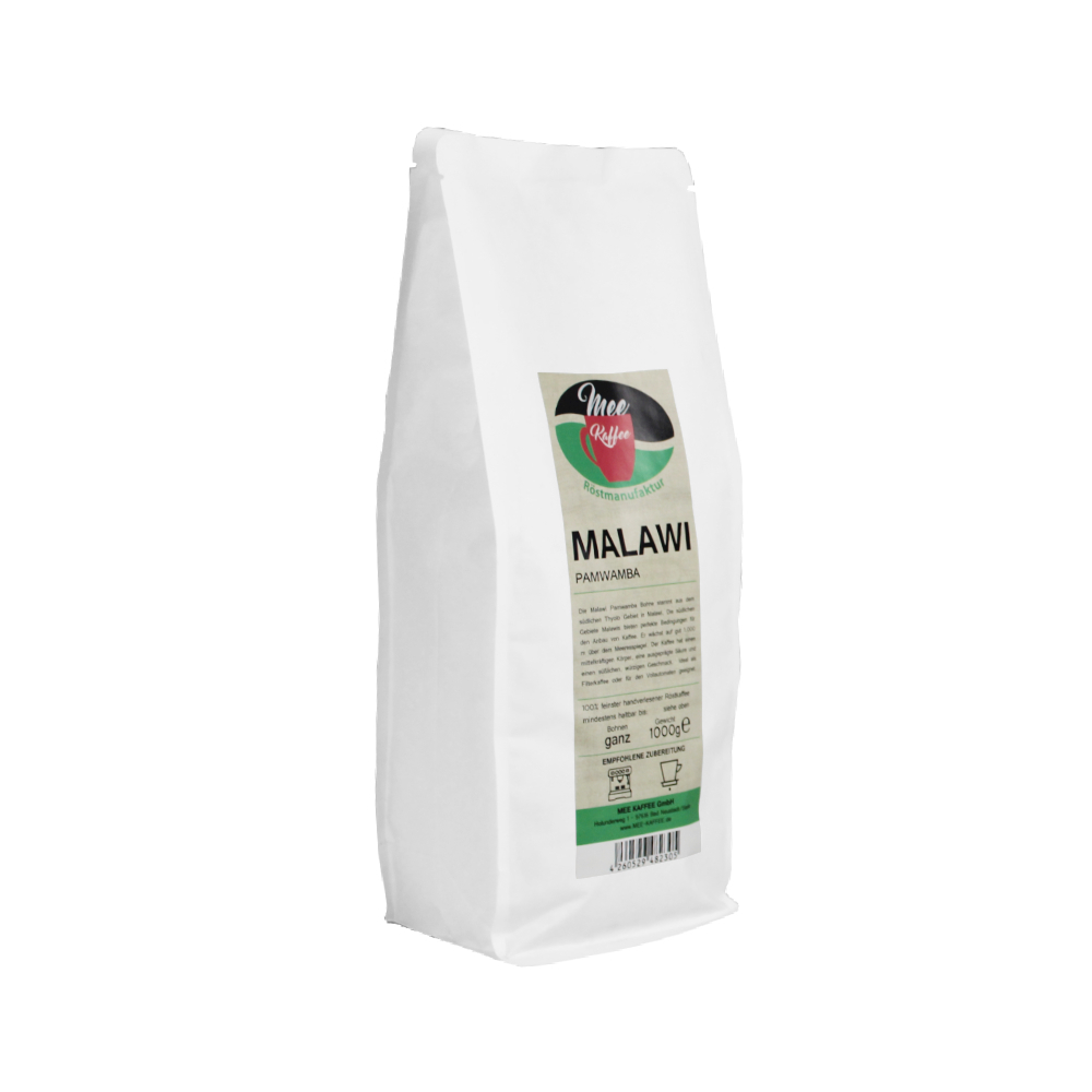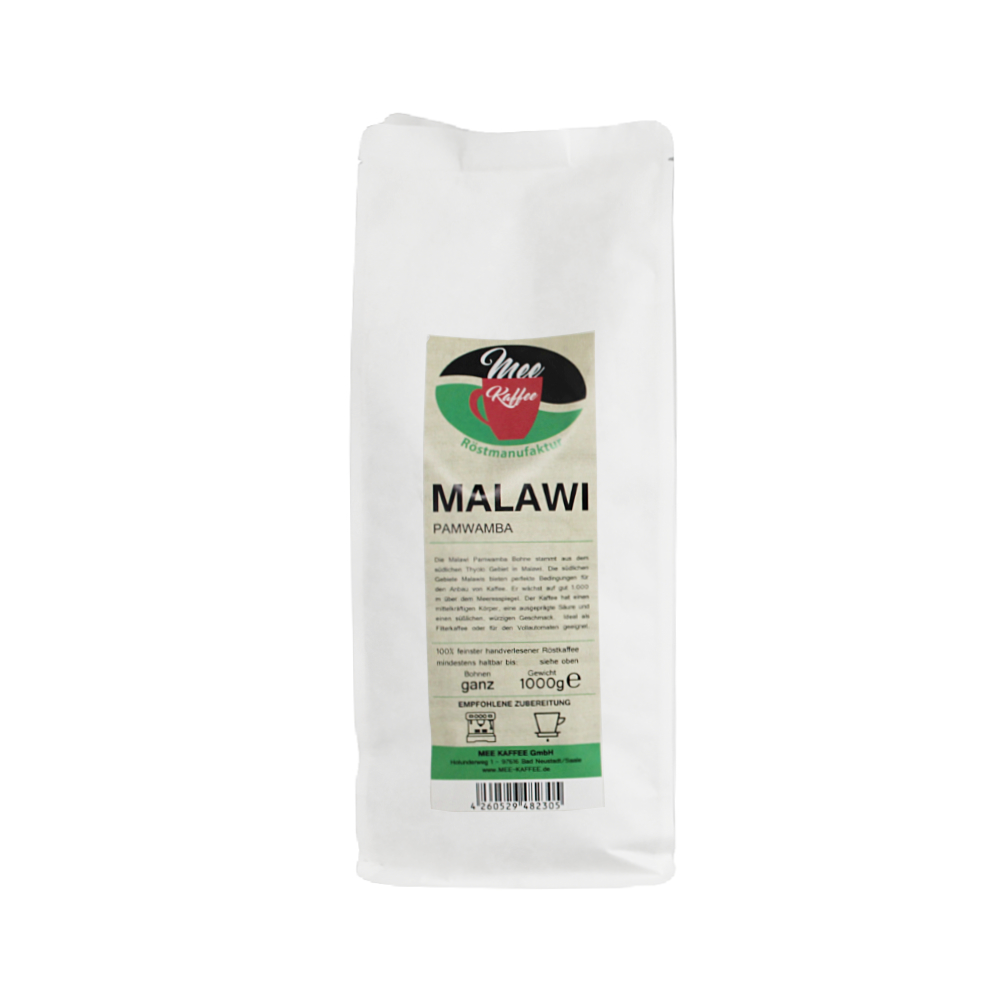 Mee Kaffee "Malawi Pamwamba" Die Malawi Pamwamba Bohne stammt aus dem südlichen Thyolo Gebiet in Malawi. Die südlichen Gebiete Malawis bieten perfekte Bedingungen für den Anbau von Kaffee. Er wächst auf gut 1000m über dem Meeresspiegel. Der Kaffee hat einen mittelkräftigen Körper, eine ausgeprägte Säure und einen süßlichen, würzigen Geschmack. Ideal als Filterkaffee oder für den Vollautomaten geeignet.