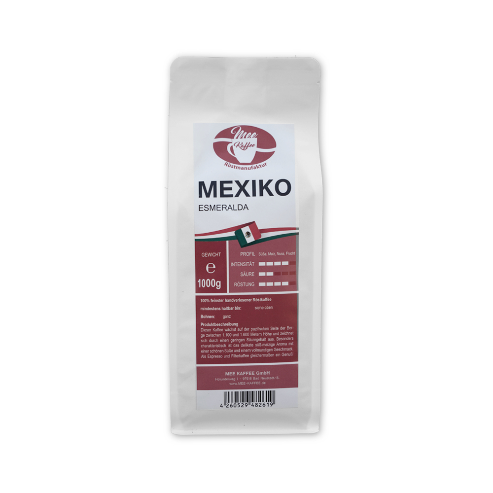Mee Kaffee "Mexiko Esmeralda" Dieser Kaffee wächst auf der pazifischen Seite der Berge zwischen 1.100m und 1.600m Höhe und zeichnet sich durch einen geringen Säuregehalt aus. Besonders charakteristisch ist das delikate süß-malzige Aroma mit einer schönen Süße und einem vollmundigen Geschmack. Als Espresso und Filterkaffee gleichermassen ein Genuß.
